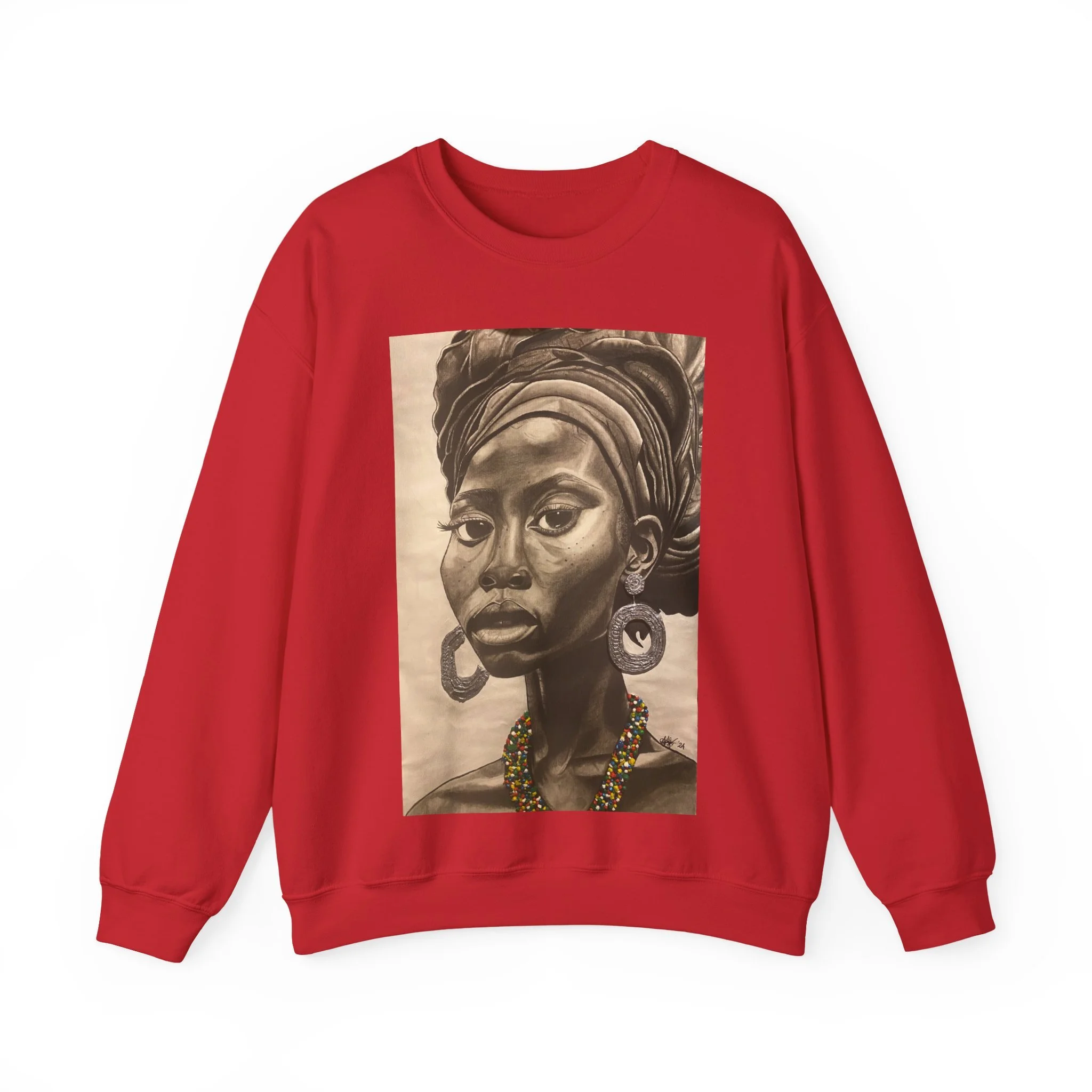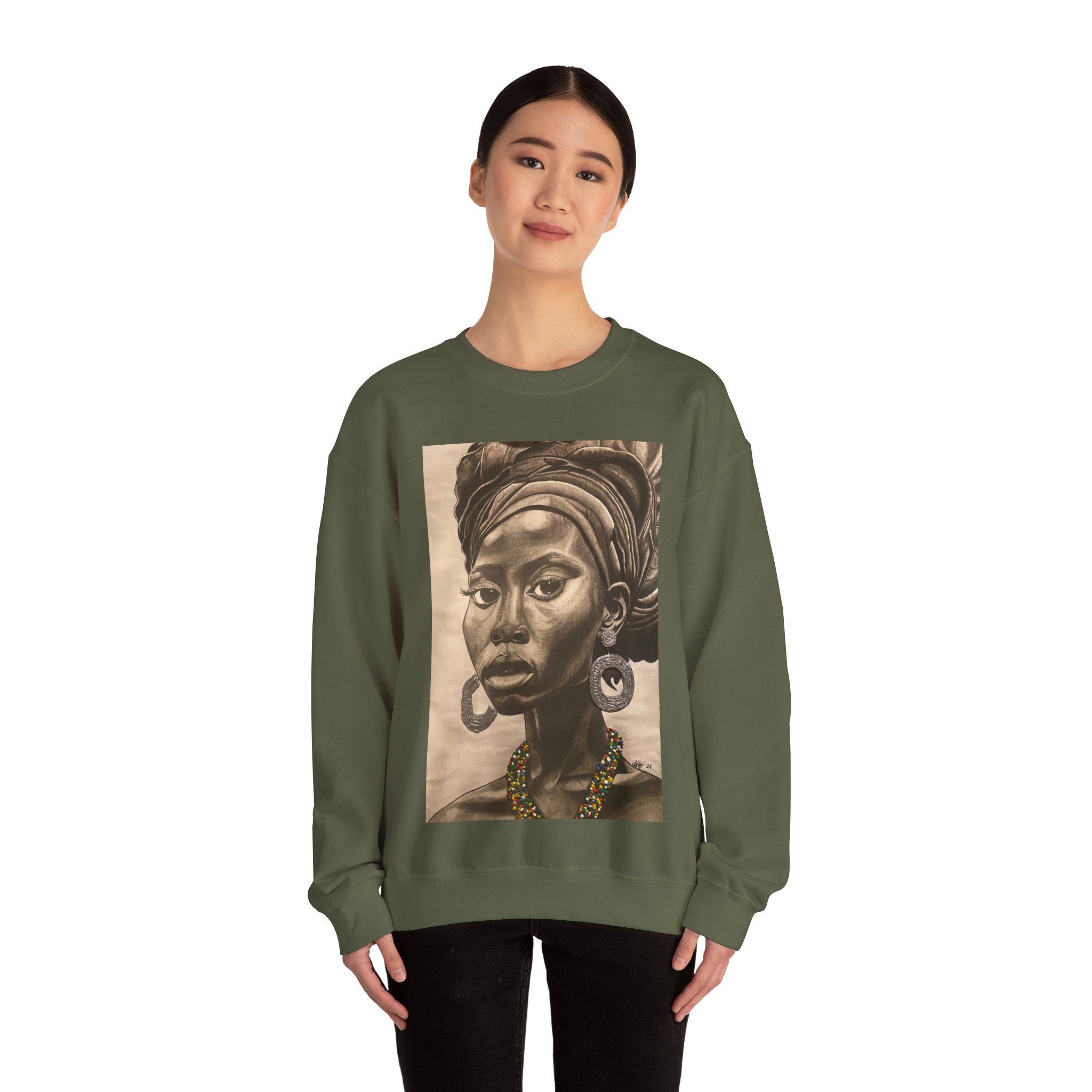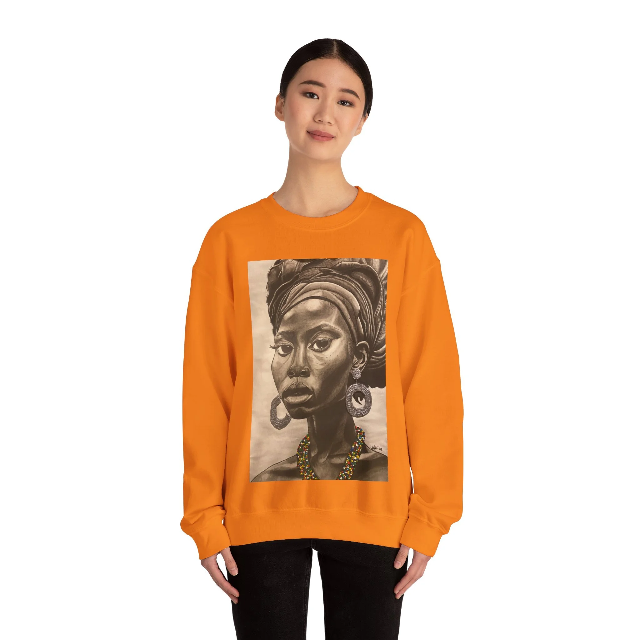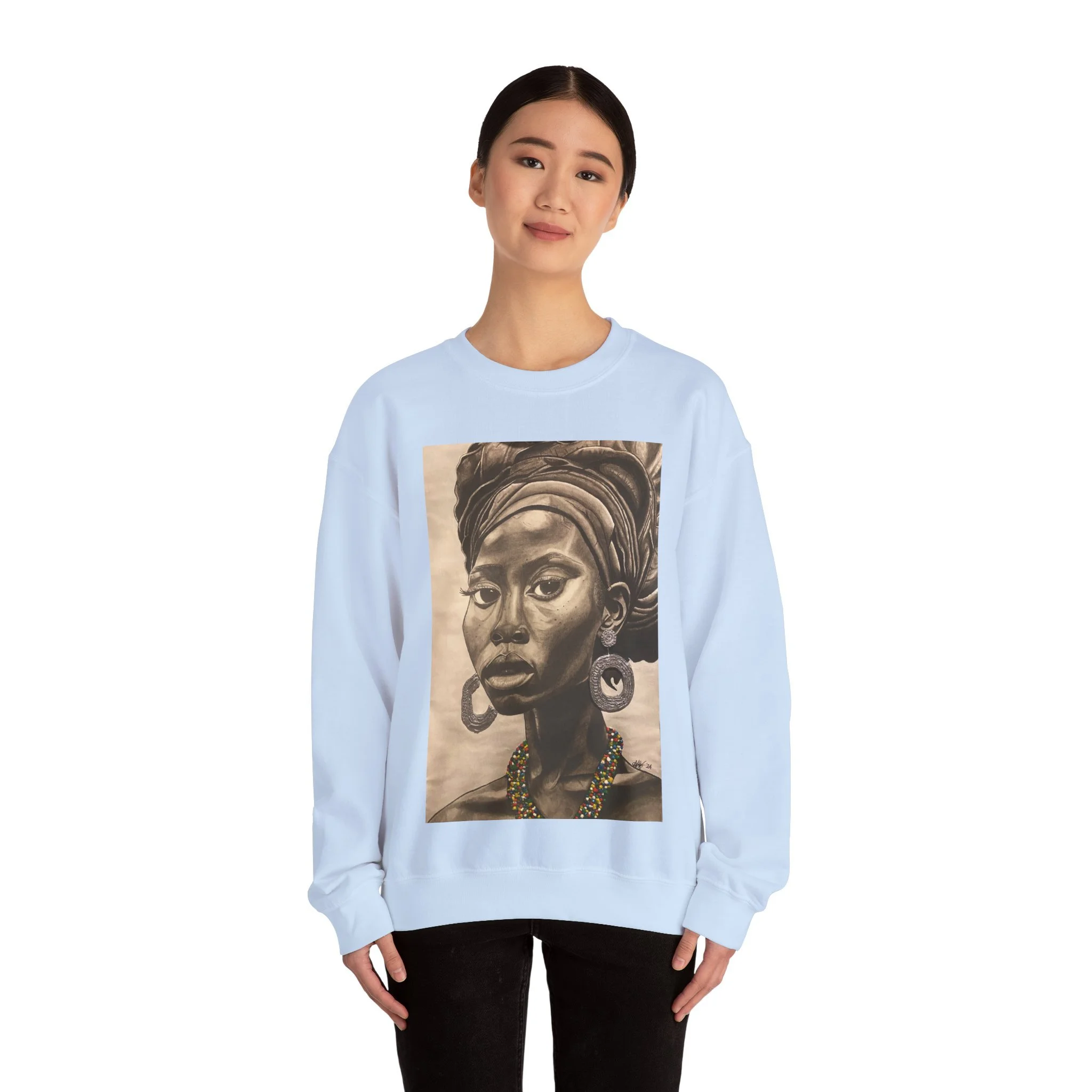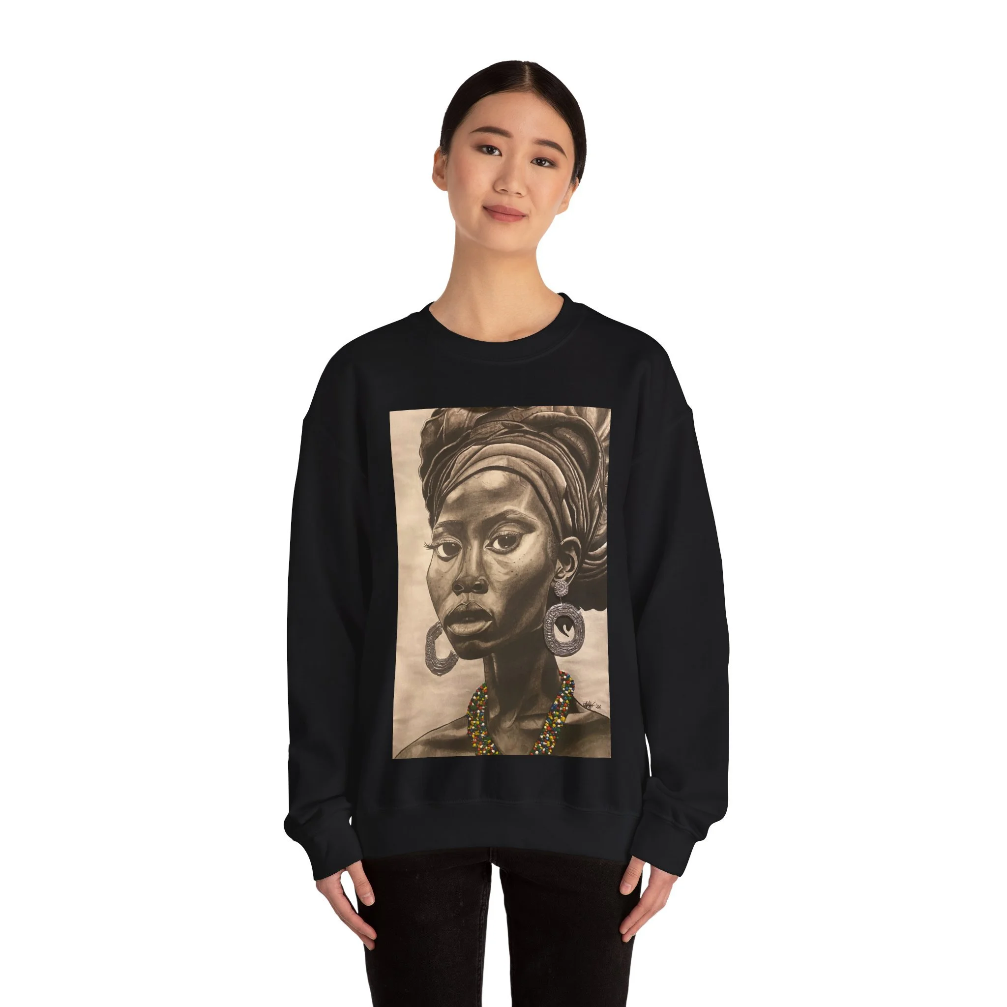 This crewneck sweatshirt carries a quiet strength. A soft-white, medium-heavy knit provides a cozy canvas for the striking portrait printed on the front — a dignified woman rendered in warm sepia tones, headwrap and statement jewelry telling a story of heritage and resilience. The fit is classic and relaxed; cuffs and waistband hold shape while the breathable cotton-poly blend keeps it comfortable from morning coffee to late-night walks. Subtle branding at the upper back keeps the focus on the artwork, so the piece reads like wearable art rather than loud streetwear. Wear it with jeans and boots or layered over a dress — it brings an intimate, thoughtful mood to everyday outfits and moments when you want to feel seen and steady.