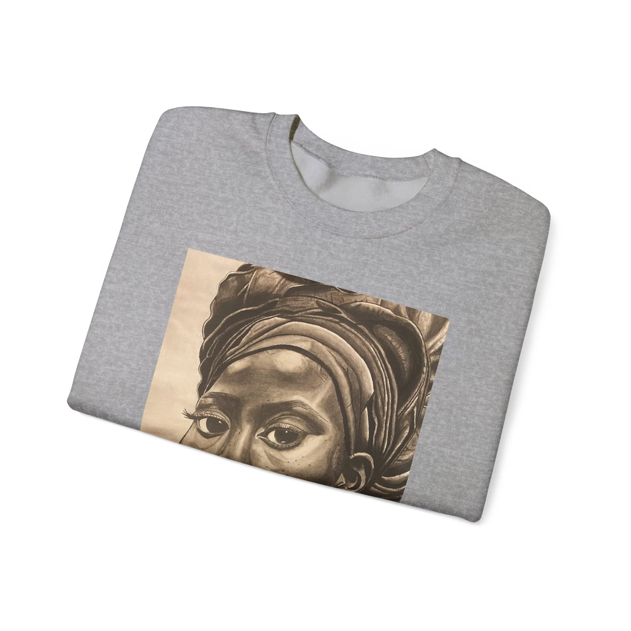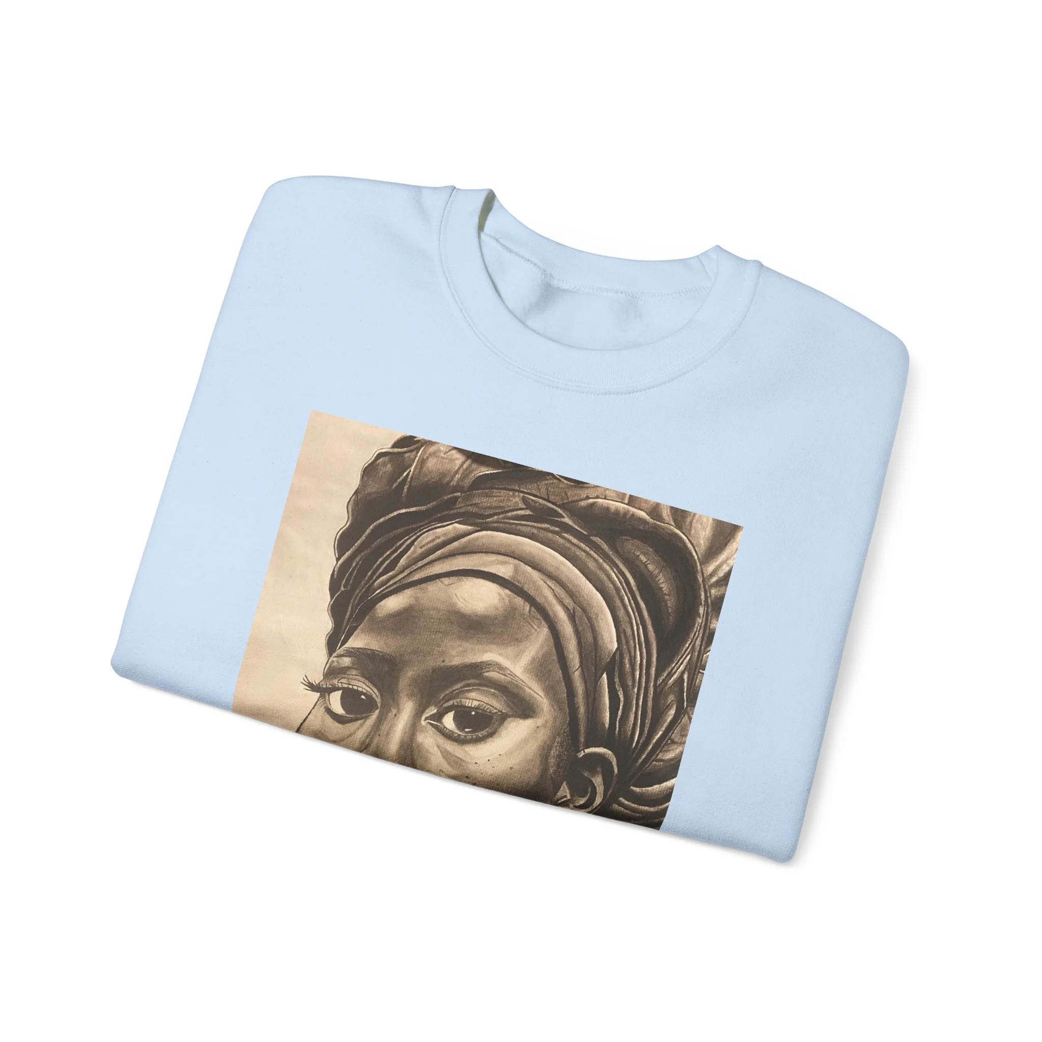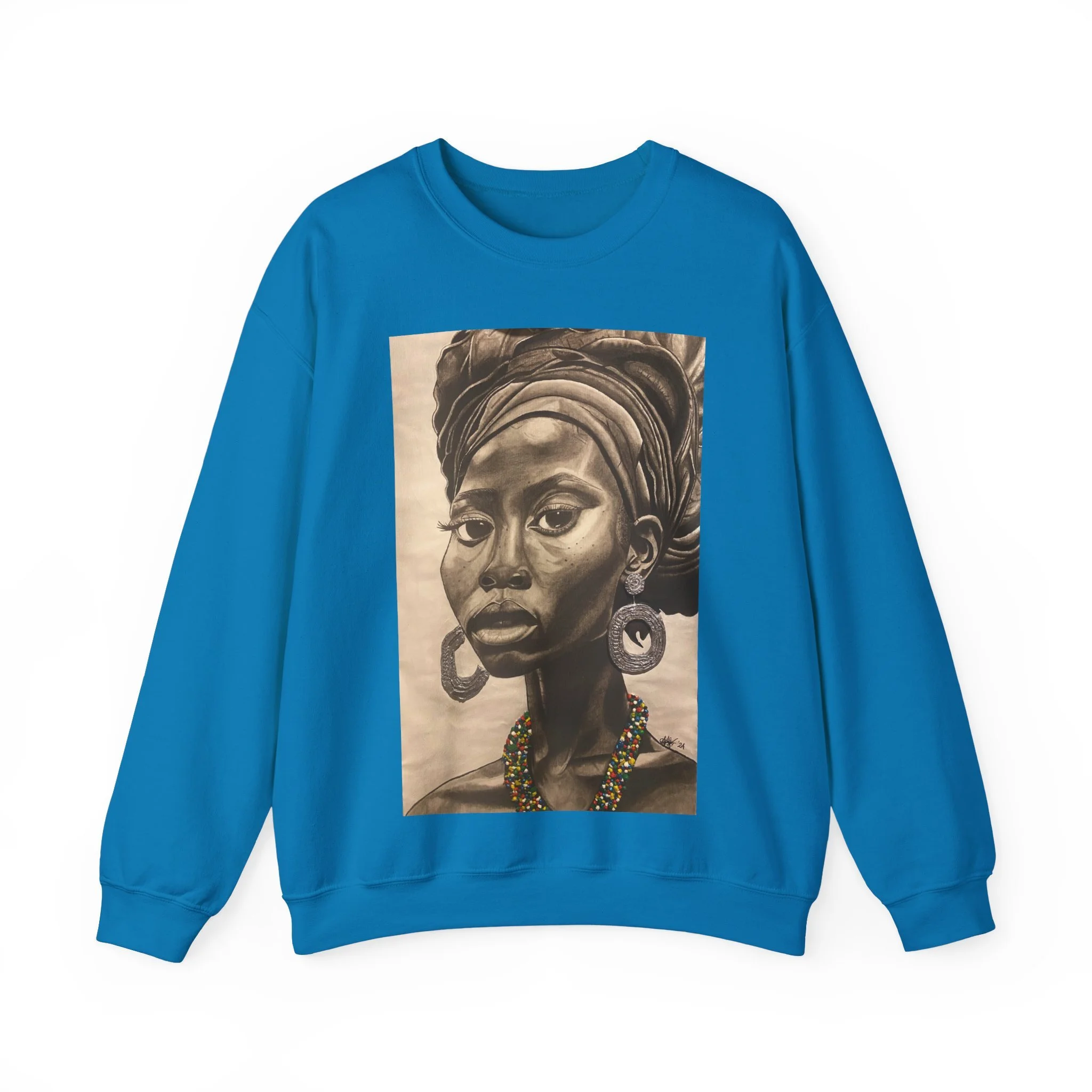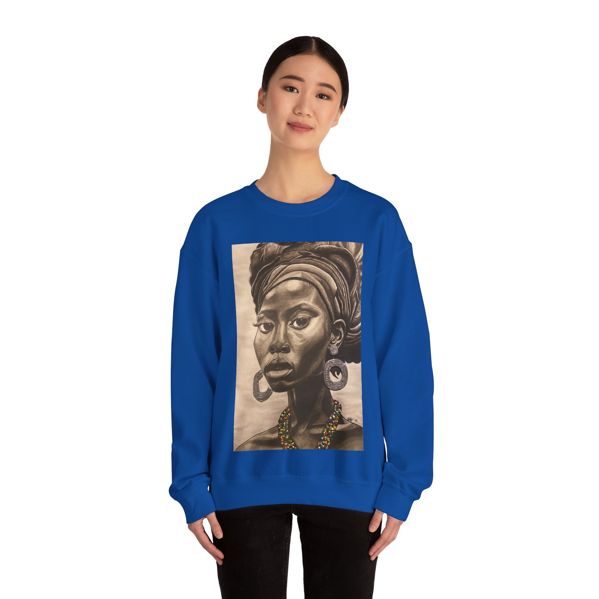 This crewneck sweatshirt carries a quiet strength. A soft-white, medium-heavy knit provides a cozy canvas for the striking portrait printed on the front — a dignified woman rendered in warm sepia tones, headwrap and statement jewelry telling a story of heritage and resilience. The fit is classic and relaxed; cuffs and waistband hold shape while the breathable cotton-poly blend keeps it comfortable from morning coffee to late-night walks. Subtle branding at the upper back keeps the focus on the artwork, so the piece reads like wearable art rather than loud streetwear. Wear it with jeans and boots or layered over a dress — it brings an intimate, thoughtful mood to everyday outfits and moments when you want to feel seen and steady.