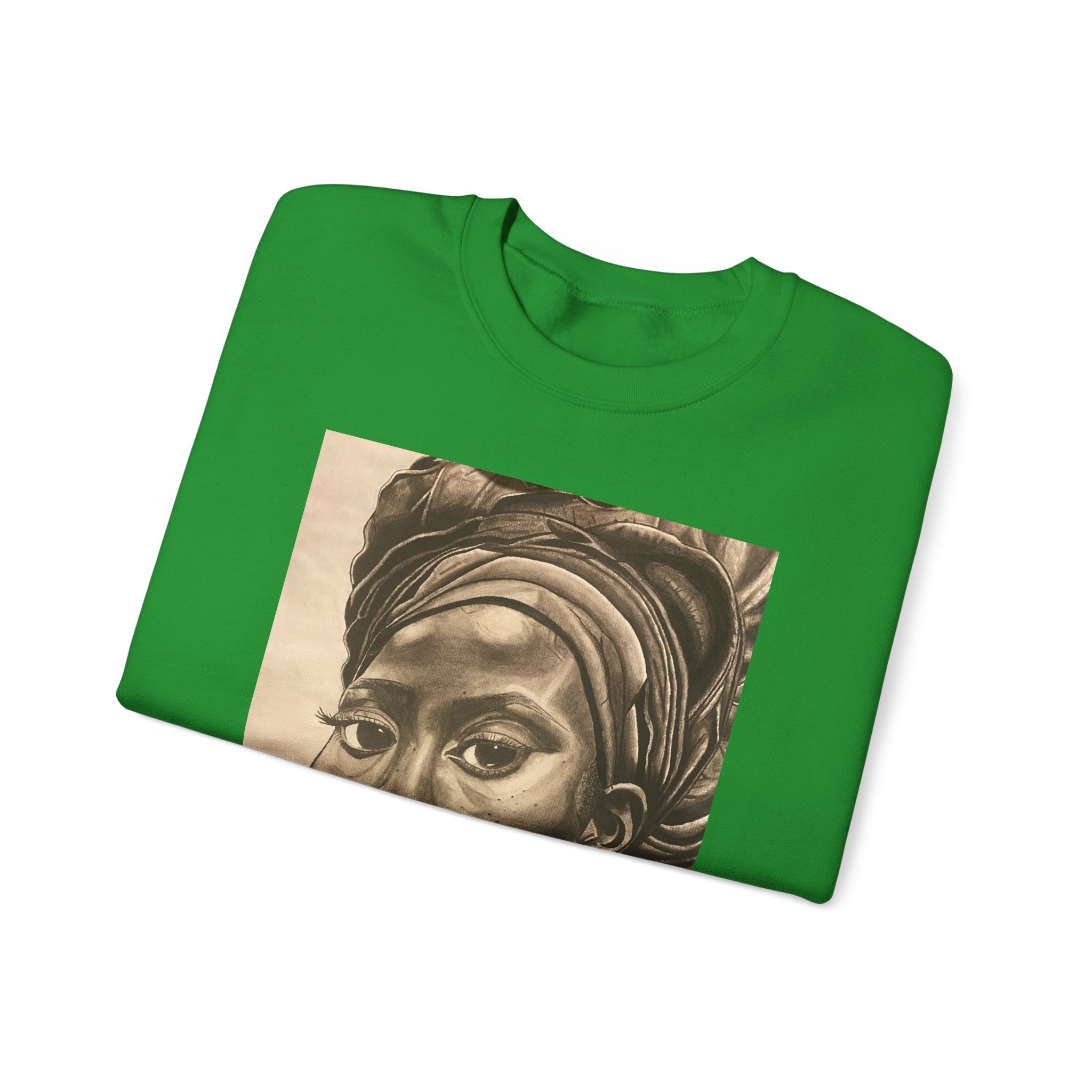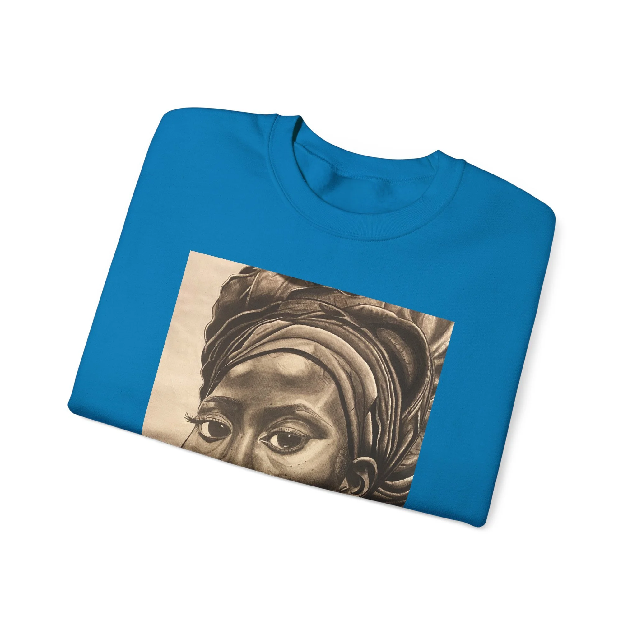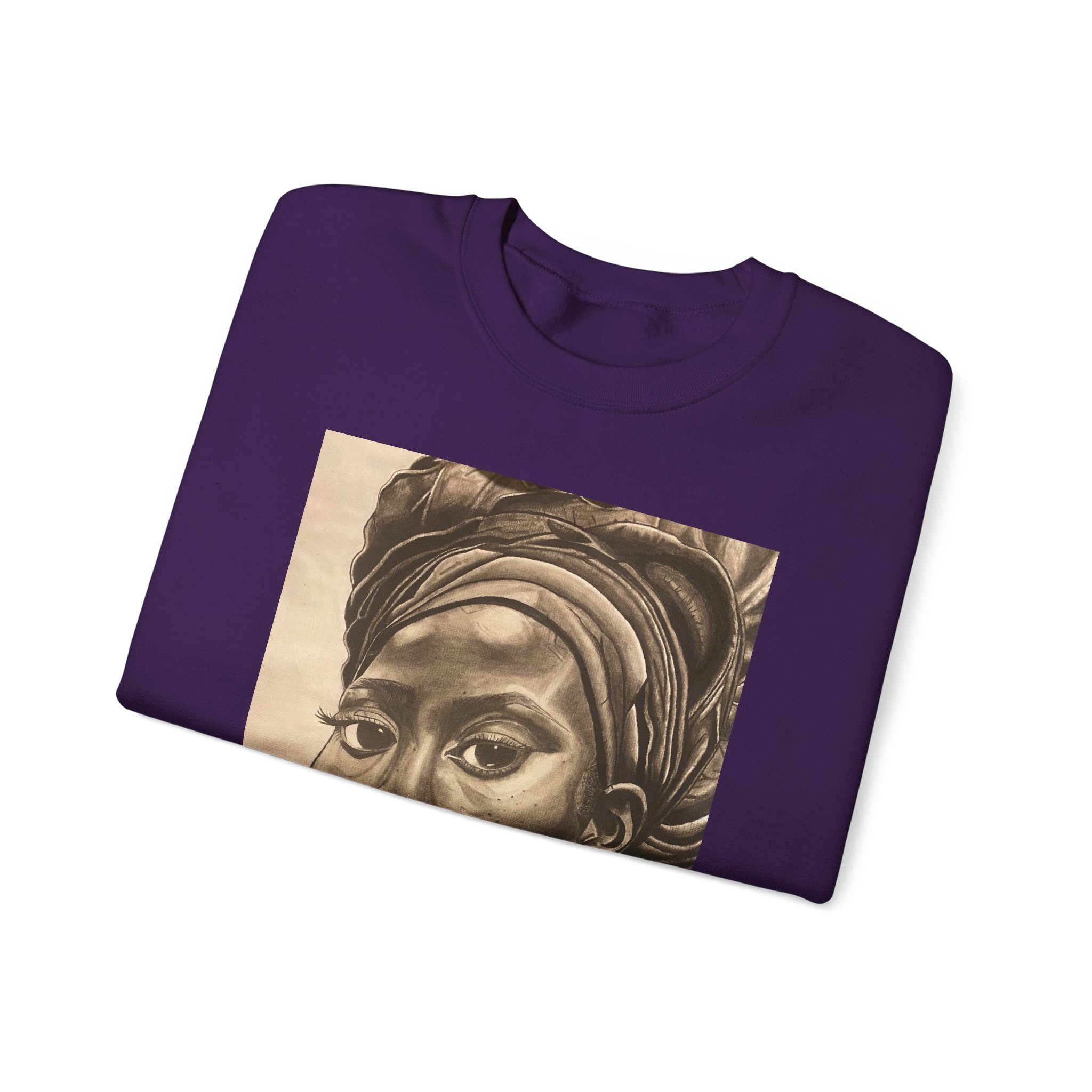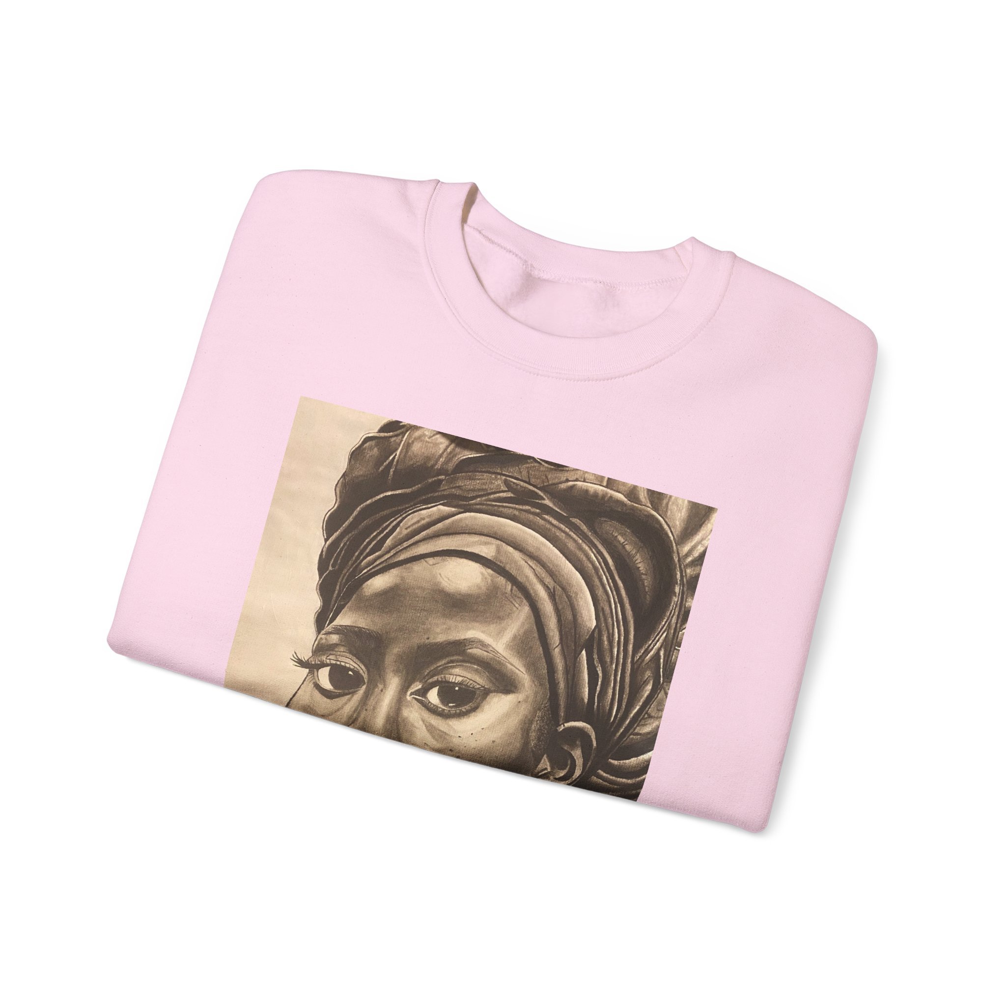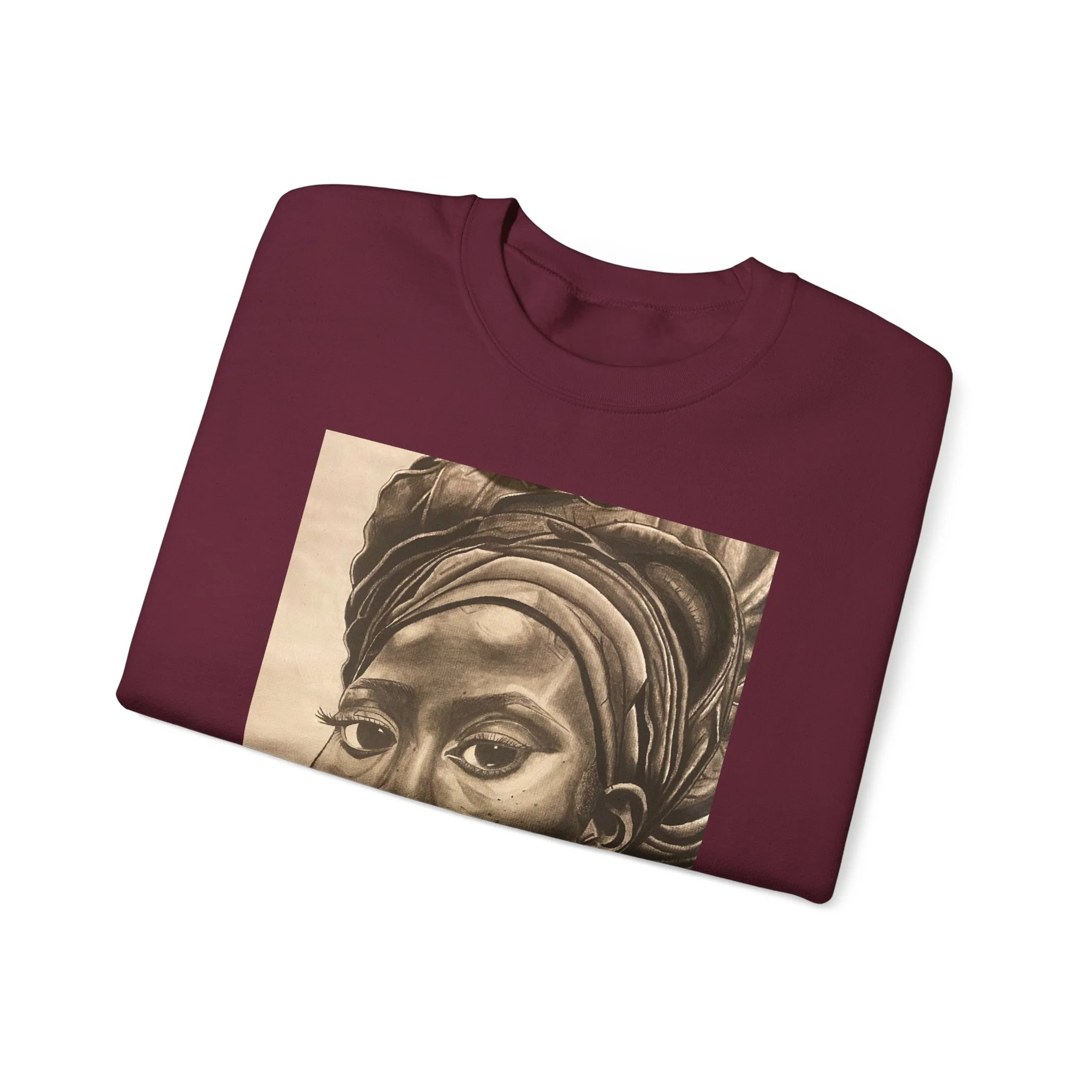 This crewneck sweatshirt carries a quiet strength. A soft-white, medium-heavy knit provides a cozy canvas for the striking portrait printed on the front — a dignified woman rendered in warm sepia tones, headwrap and statement jewelry telling a story of heritage and resilience. The fit is classic and relaxed; cuffs and waistband hold shape while the breathable cotton-poly blend keeps it comfortable from morning coffee to late-night walks. Subtle branding at the upper back keeps the focus on the artwork, so the piece reads like wearable art rather than loud streetwear. Wear it with jeans and boots or layered over a dress — it brings an intimate, thoughtful mood to everyday outfits and moments when you want to feel seen and steady.