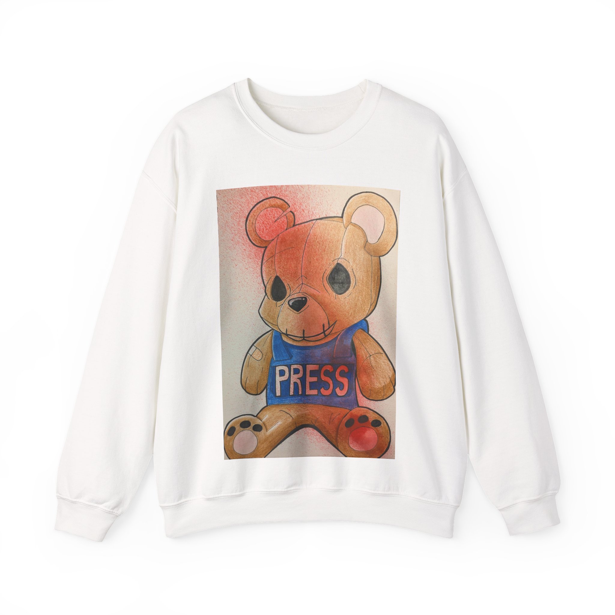 This cozy crewneck brings a soft, slightly nostalgic mood to everyday wear. A hand-drawn teddy bear, shaded with warm pastels and wearing a ’PRESS’ sweater, sits centered on a clean white field — its slightly worn, sketchbook look feels both playful and quietly introspective. The sweatshirt’s classic cut and medium-heavy 50/50 cotton-poly blend make it a lived-in layer for cool mornings, late-night walks, or slow weekends at a café. Small, thoughtful details — a tear-away label, durable double-needle stitching, and discreet text near the upper back — keep the focus on the art while ensuring long-lasting comfort. Wear it when you want something that reads like a soft memory: approachable, a little wistful, and unmistakably personal.