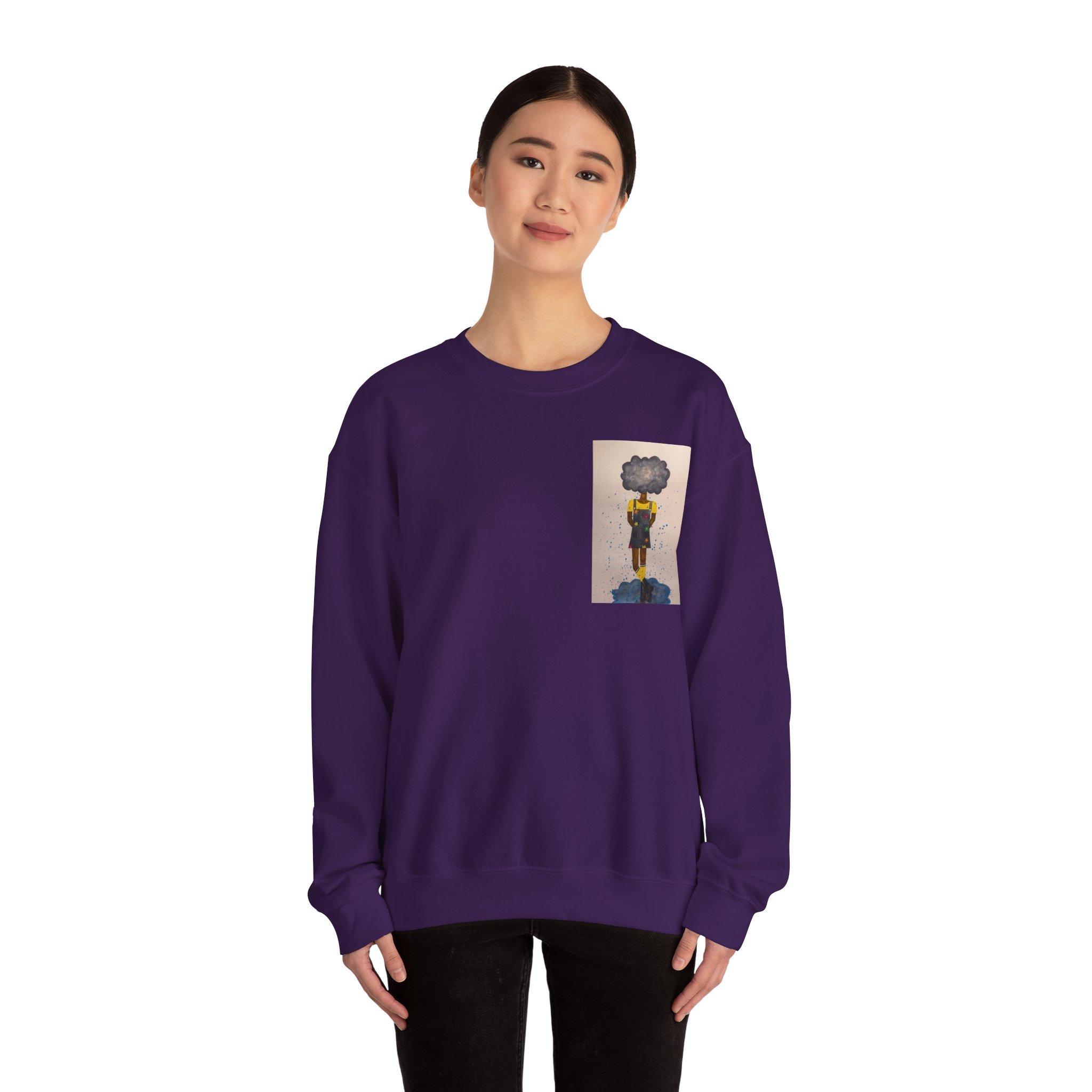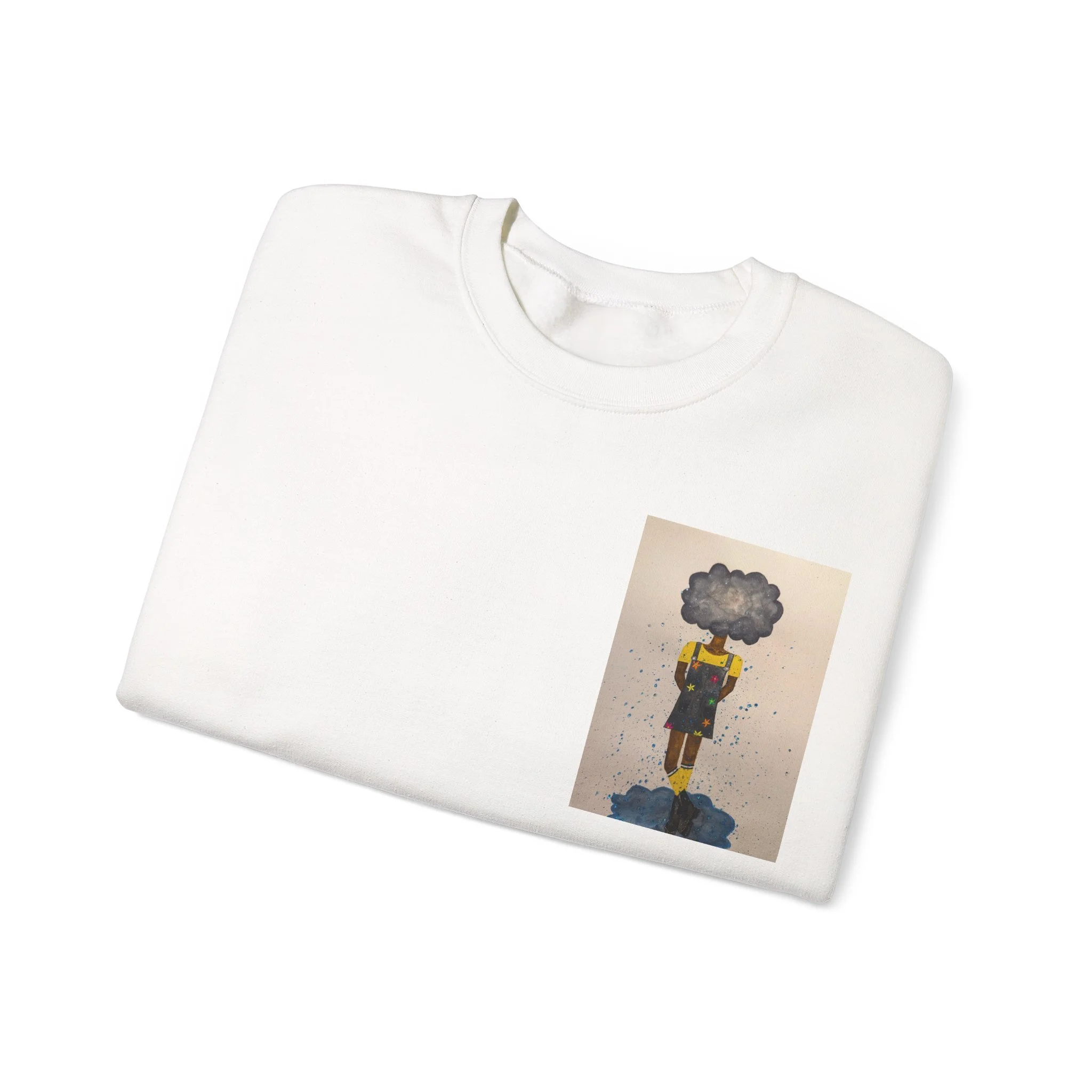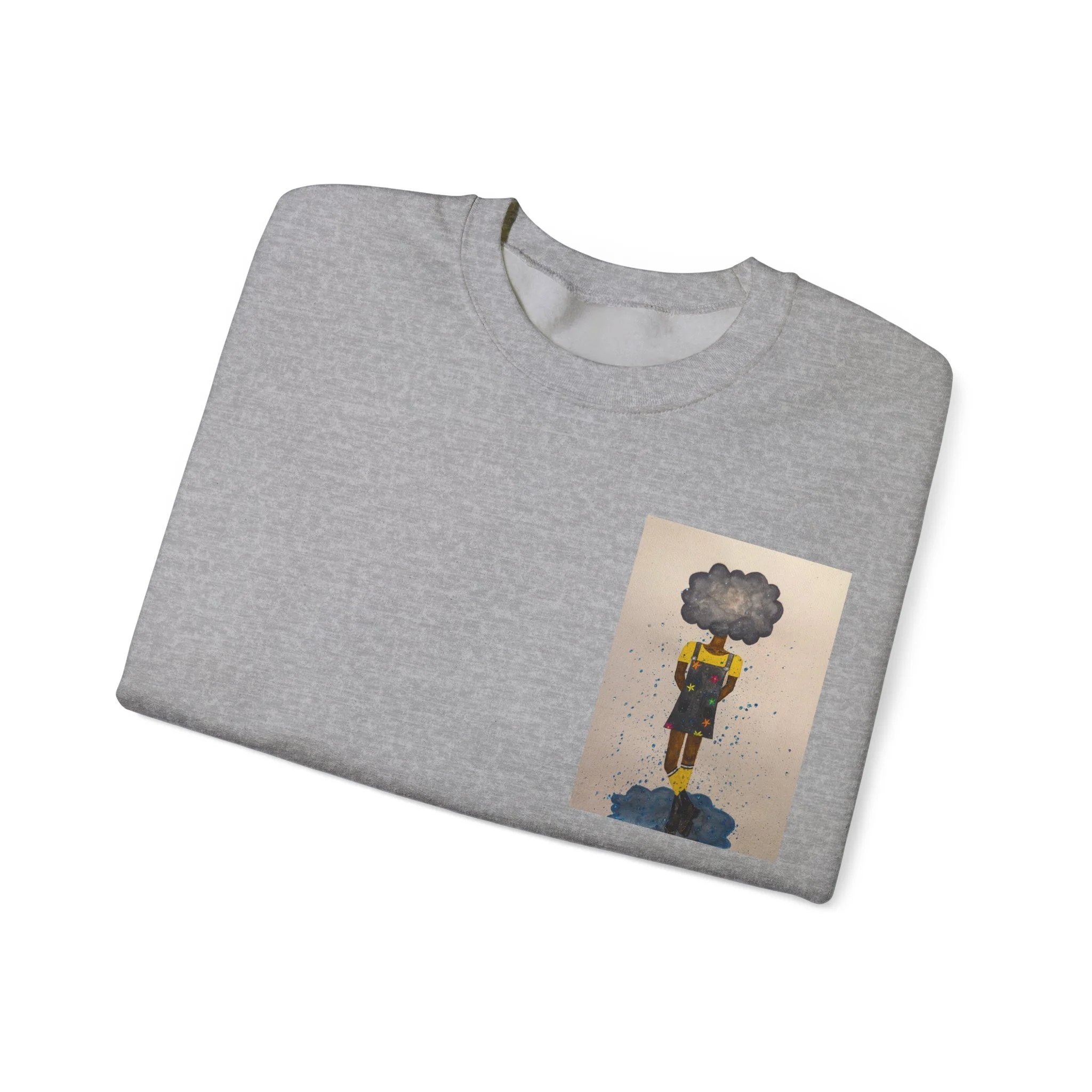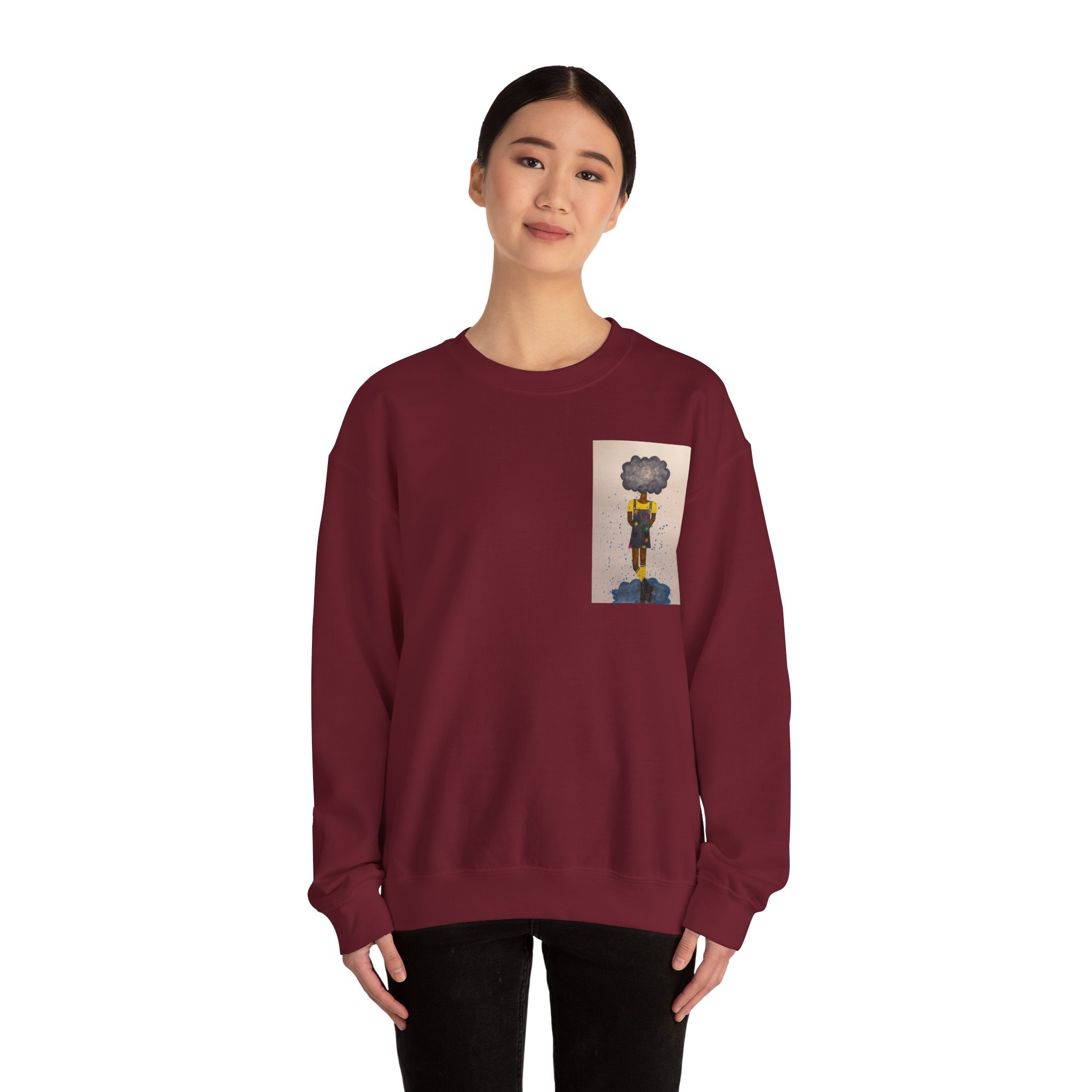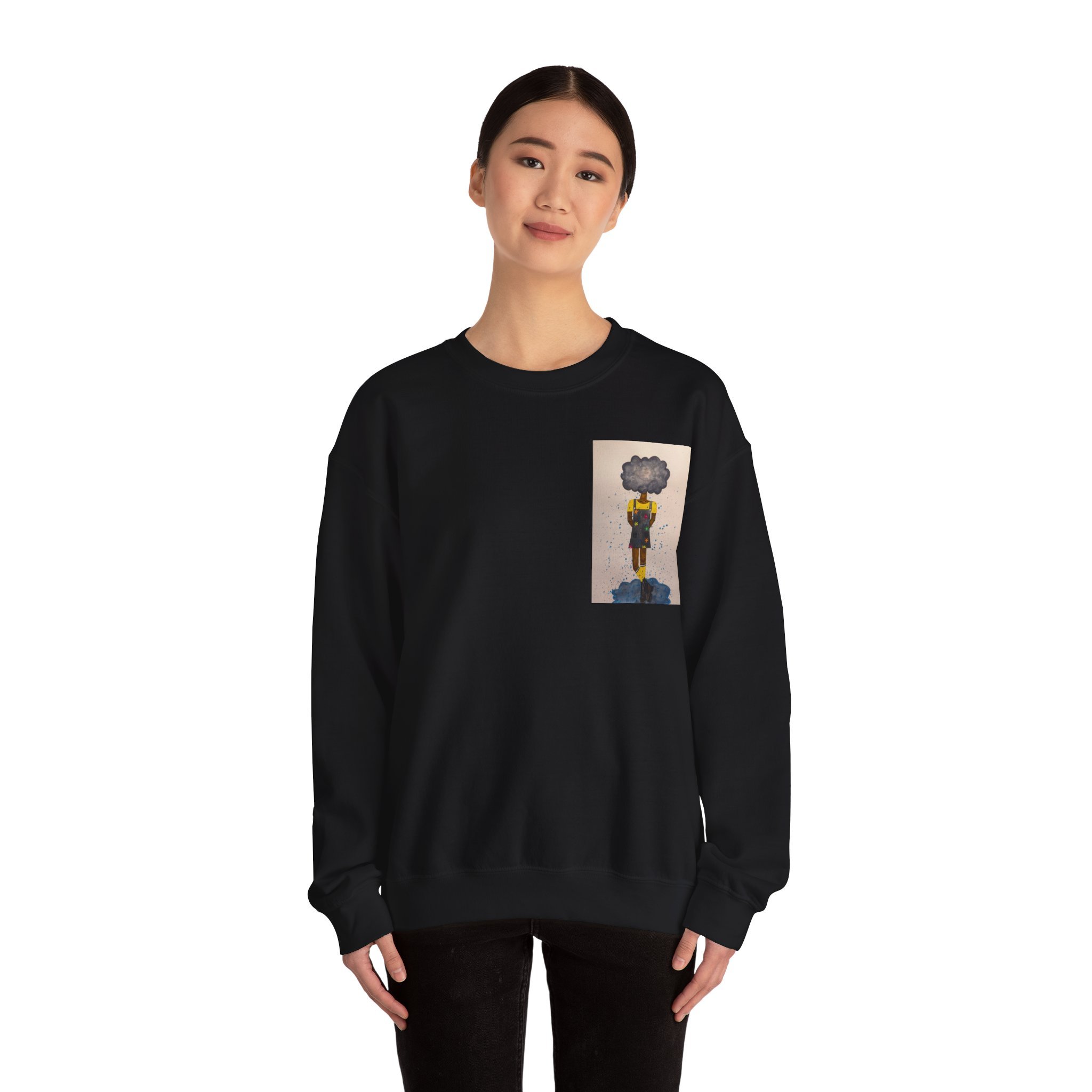 Soft, slightly oversized, and quietly expressive — this crewneck settles into your routine like a familiar song. The front shows a small, artful print that reads like a pocket-sized daydream: a lone figure with a clouded head, painted in muted tones that catch during slow afternoons. The back carries a tiny, understated text at the nape for a subtle signature detail. Wear it on walks through rainy streets, on long coffee-shop afternoons, or at low-key gallery visits. The medium-heavy cotton blend and classic crew shape keep you warm without feeling bulky. It’s the sweatshirt you reach for when you want comfort that carries a little story.
