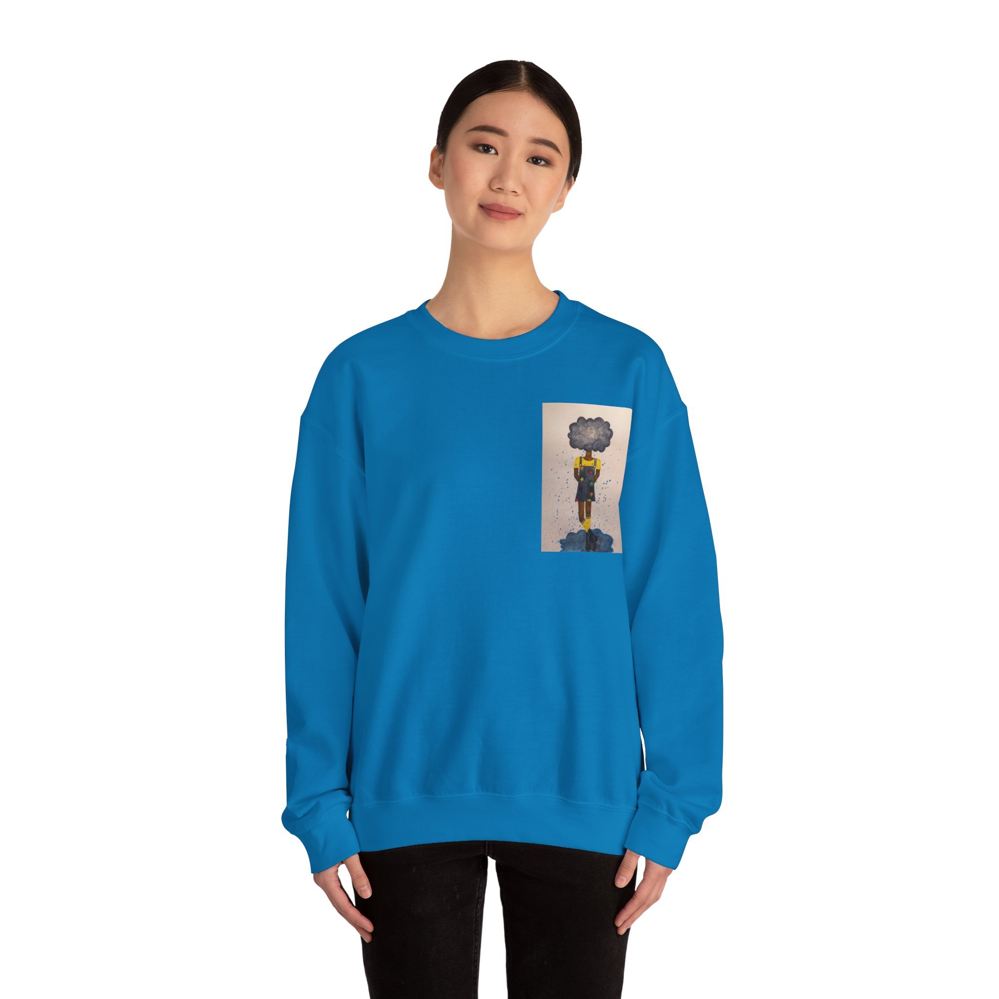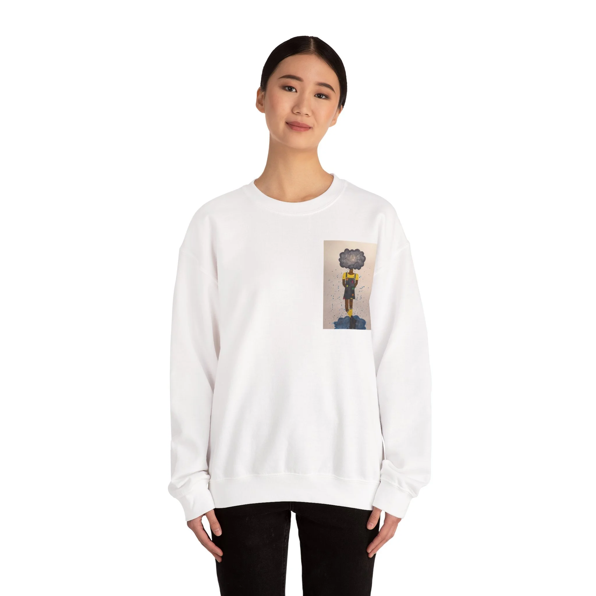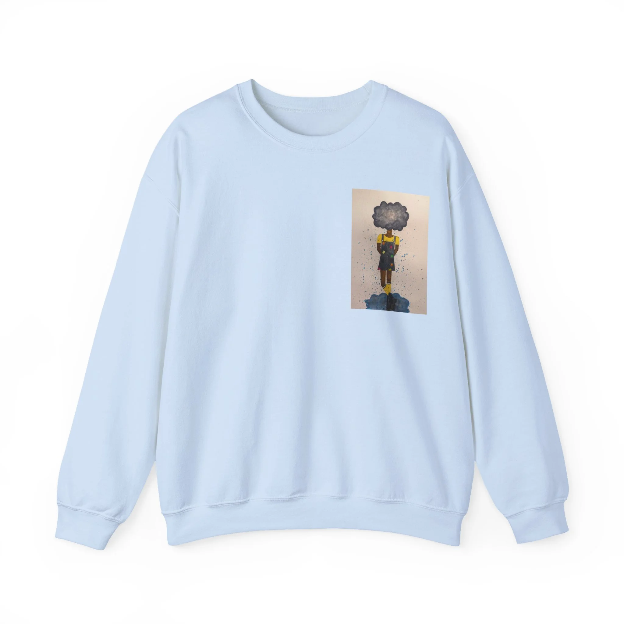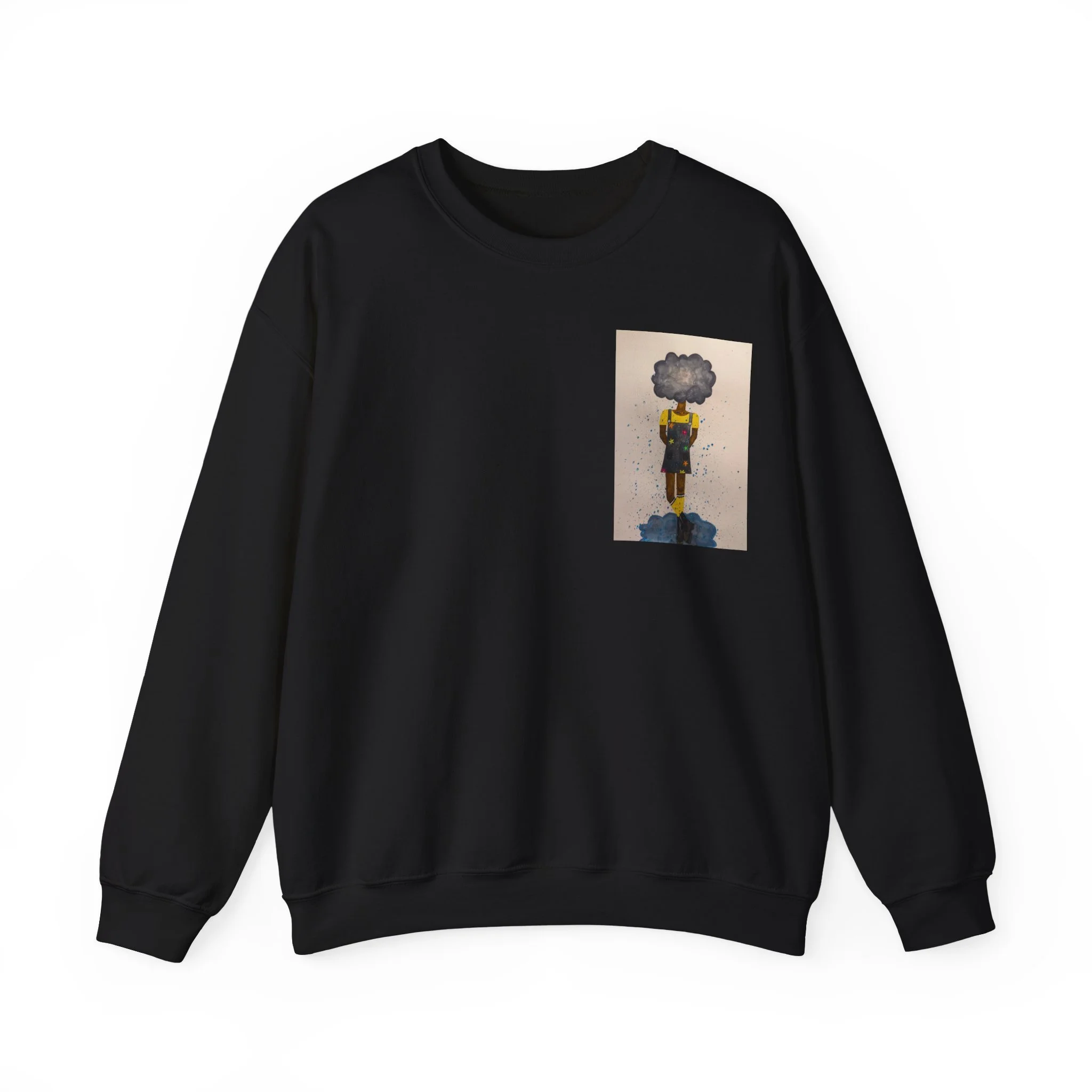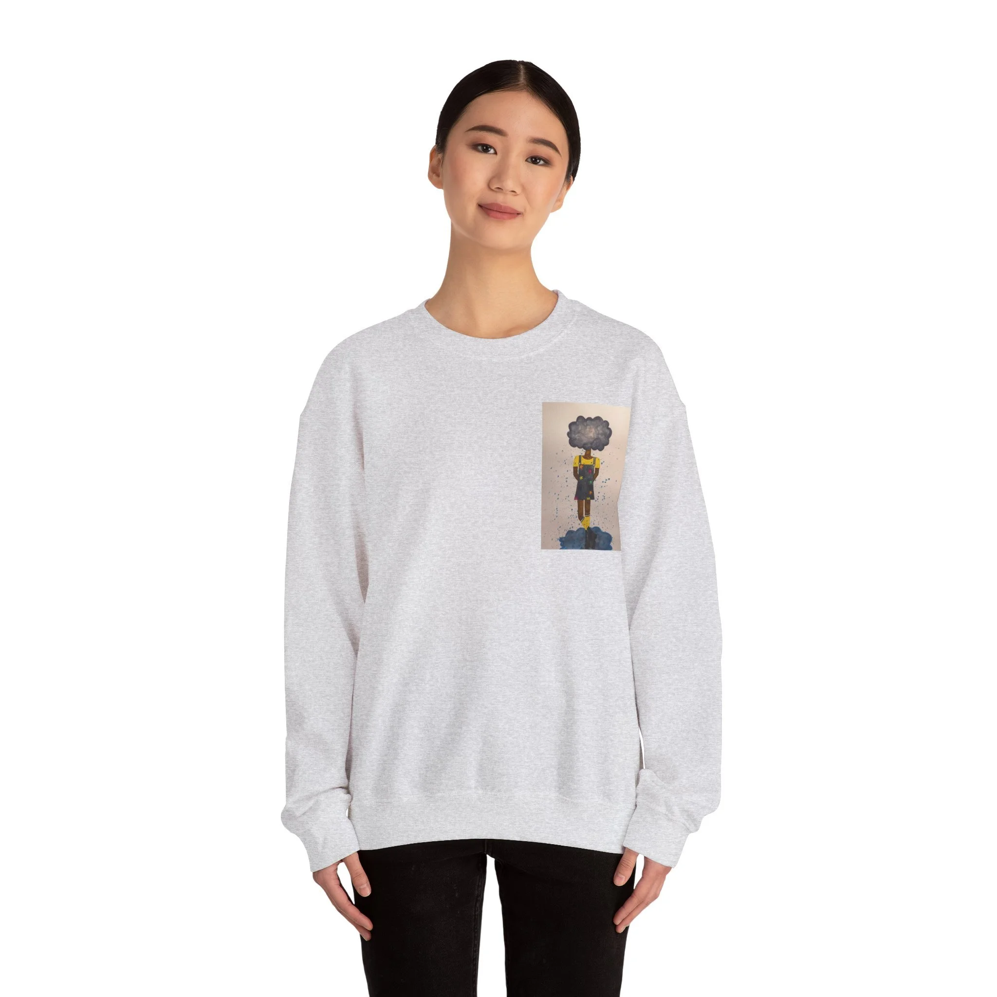 Soft, slightly oversized, and quietly expressive — this crewneck settles into your routine like a familiar song. The front shows a small, artful print that reads like a pocket-sized daydream: a lone figure with a clouded head, painted in muted tones that catch during slow afternoons. The back carries a tiny, understated text at the nape for a subtle signature detail. Wear it on walks through rainy streets, on long coffee-shop afternoons, or at low-key gallery visits. The medium-heavy cotton blend and classic crew shape keep you warm without feeling bulky. It’s the sweatshirt you reach for when you want comfort that carries a little story.