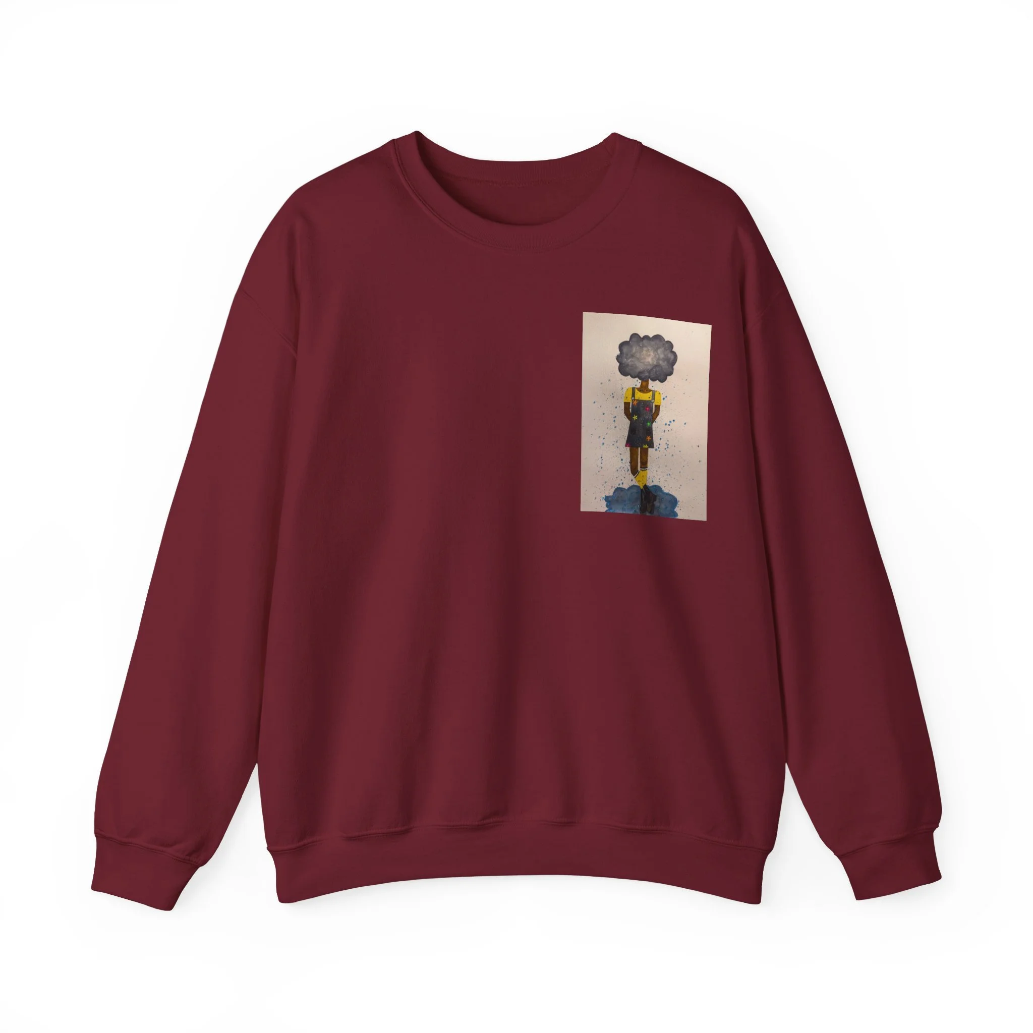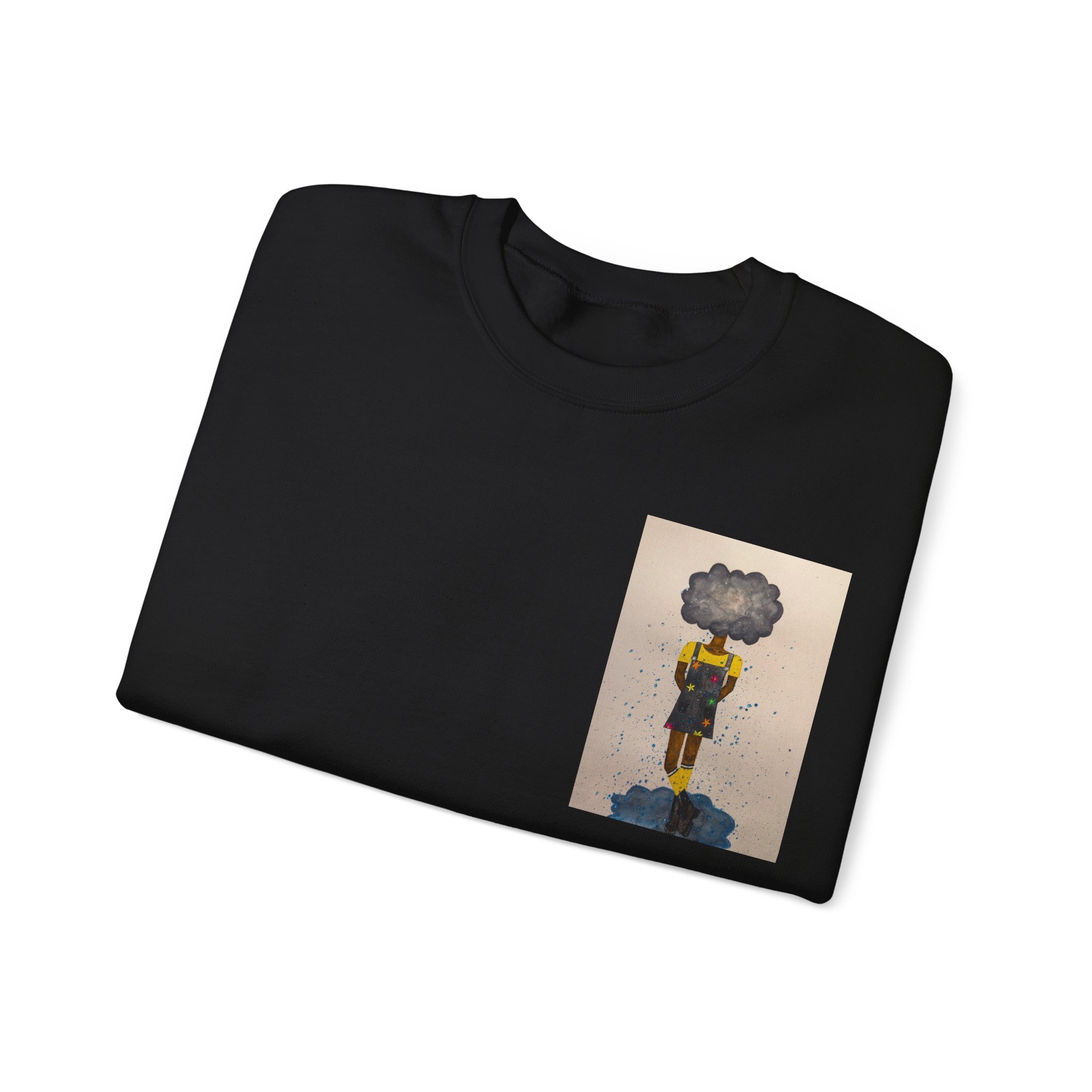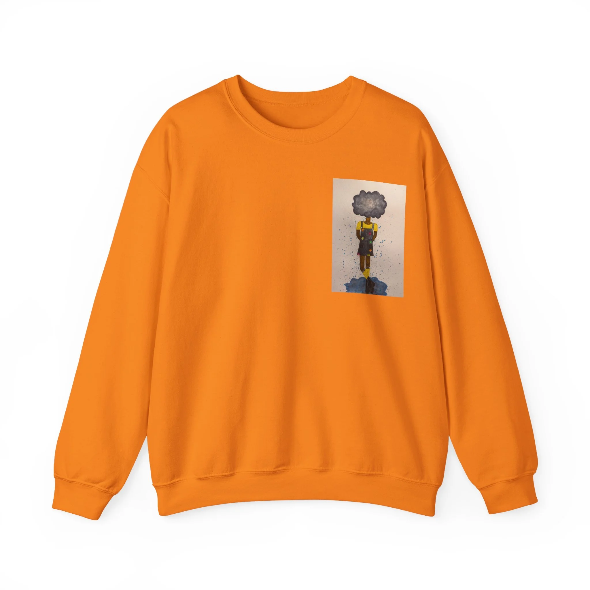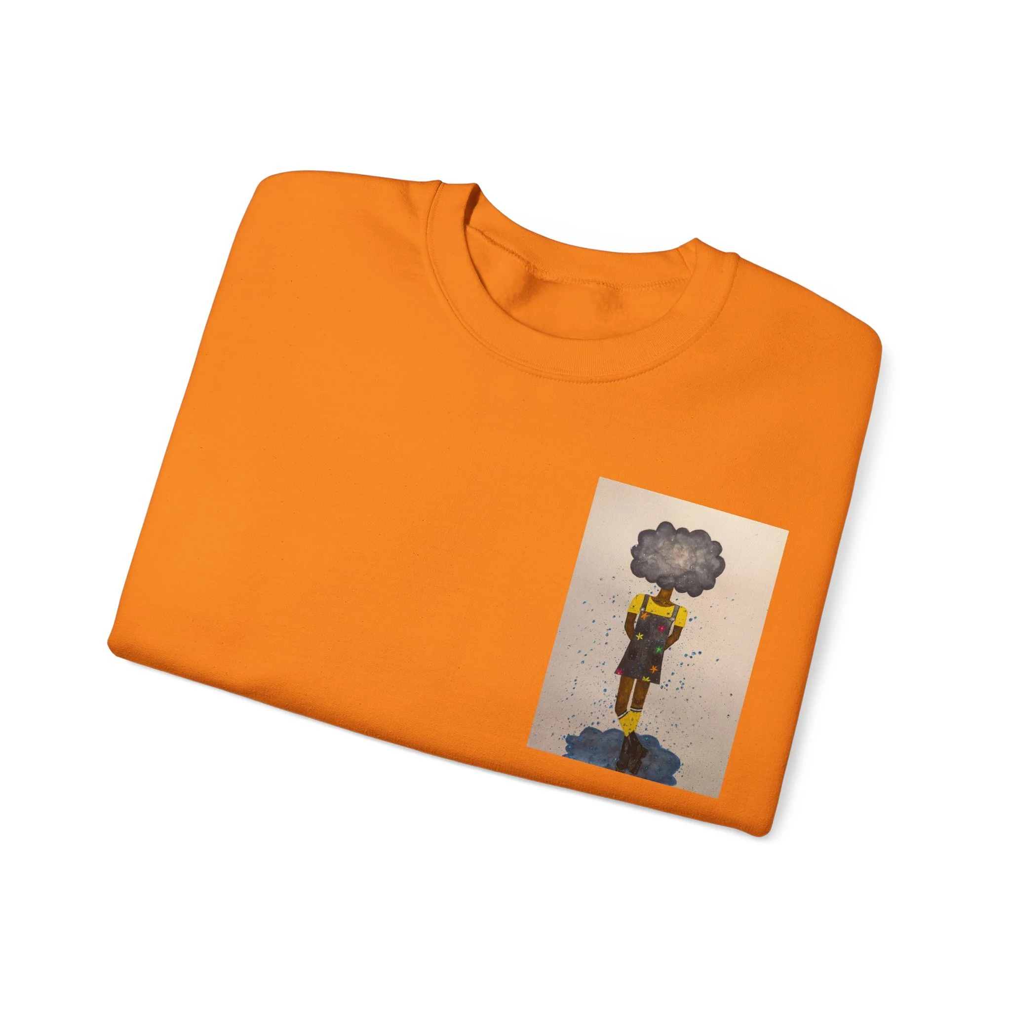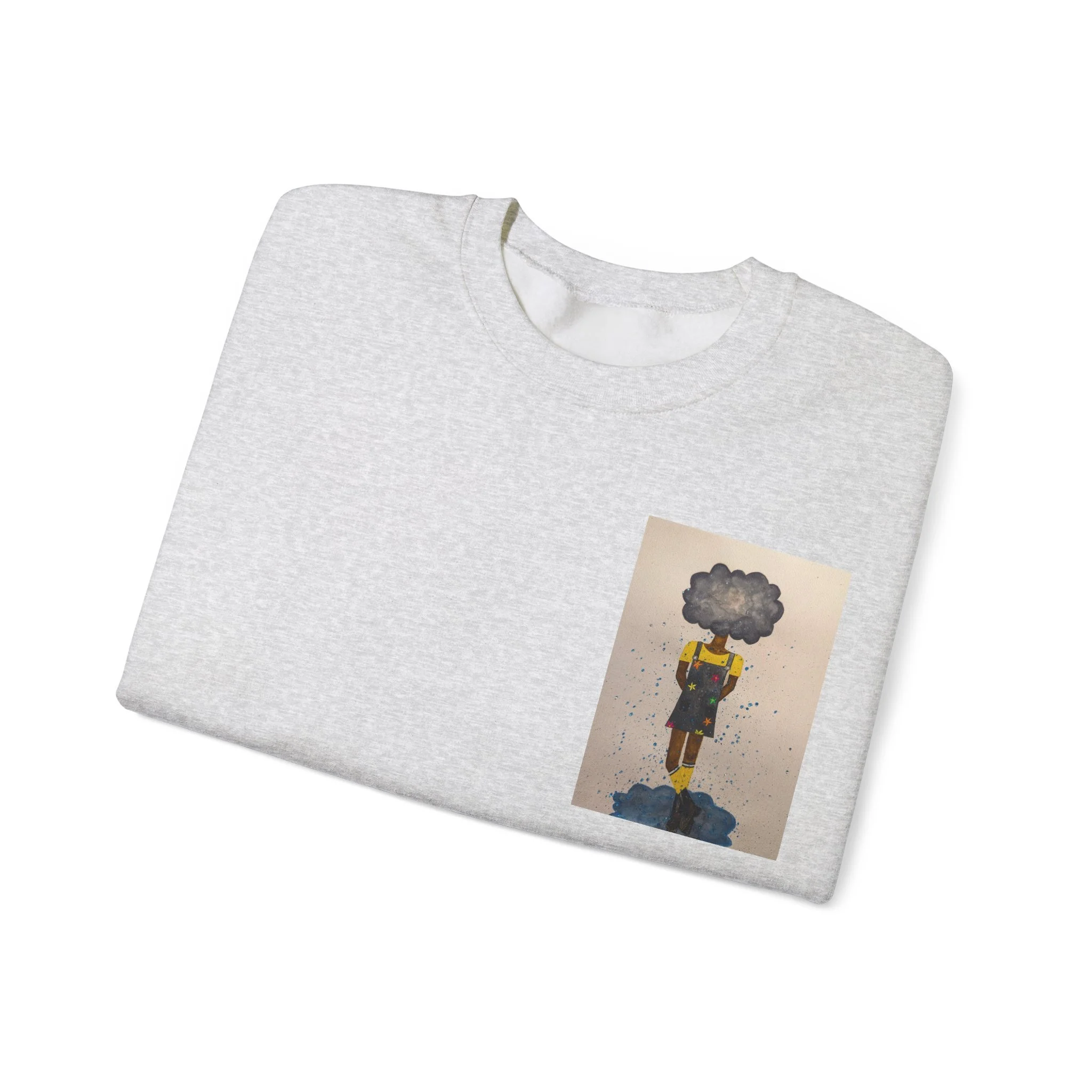 Soft, slightly oversized, and quietly expressive — this crewneck settles into your routine like a familiar song. The front shows a small, artful print that reads like a pocket-sized daydream: a lone figure with a clouded head, painted in muted tones that catch during slow afternoons. The back carries a tiny, understated text at the nape for a subtle signature detail. Wear it on walks through rainy streets, on long coffee-shop afternoons, or at low-key gallery visits. The medium-heavy cotton blend and classic crew shape keep you warm without feeling bulky. It’s the sweatshirt you reach for when you want comfort that carries a little story.