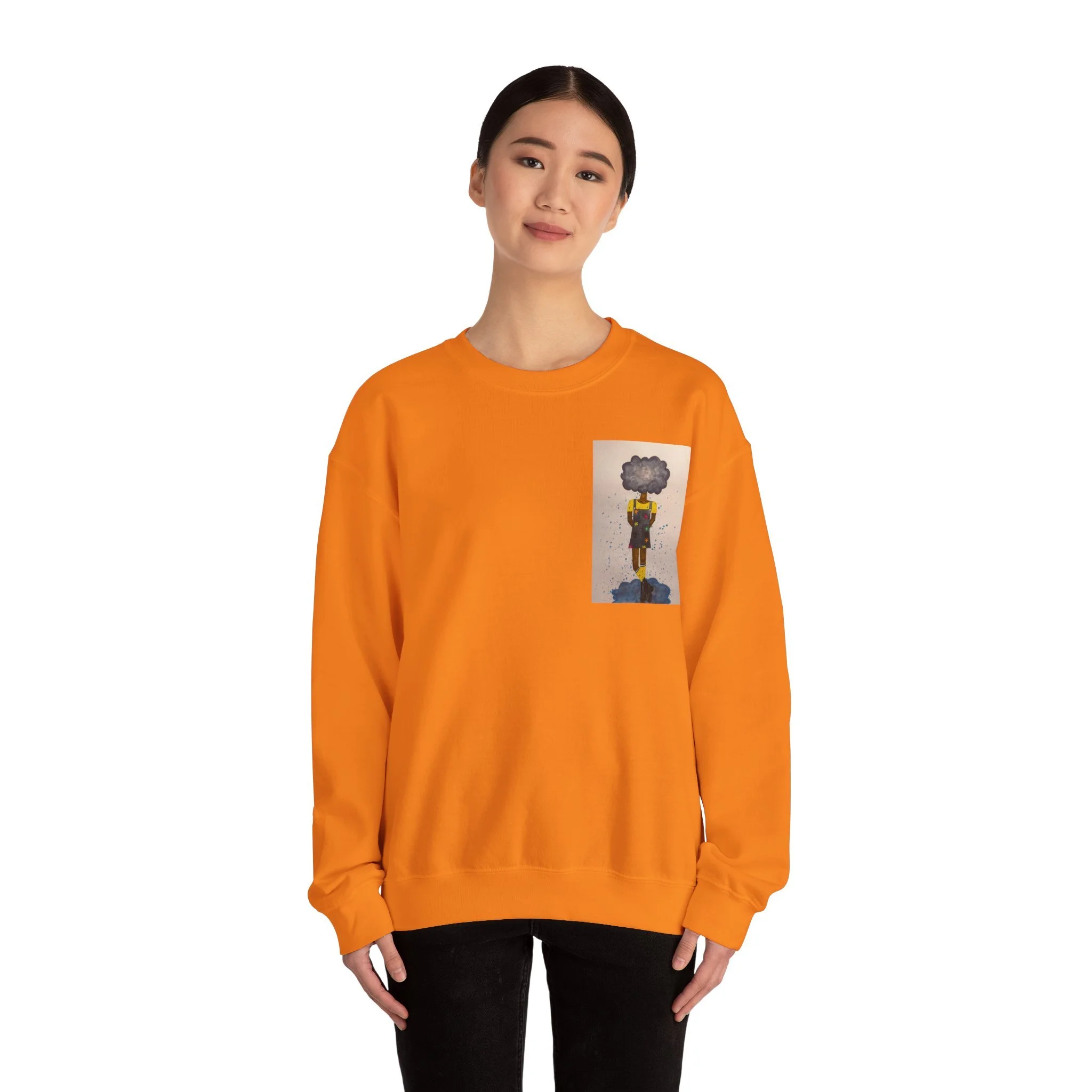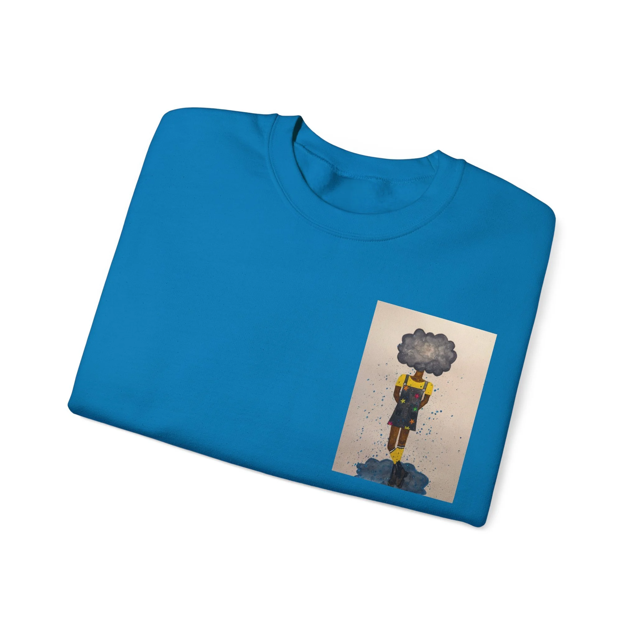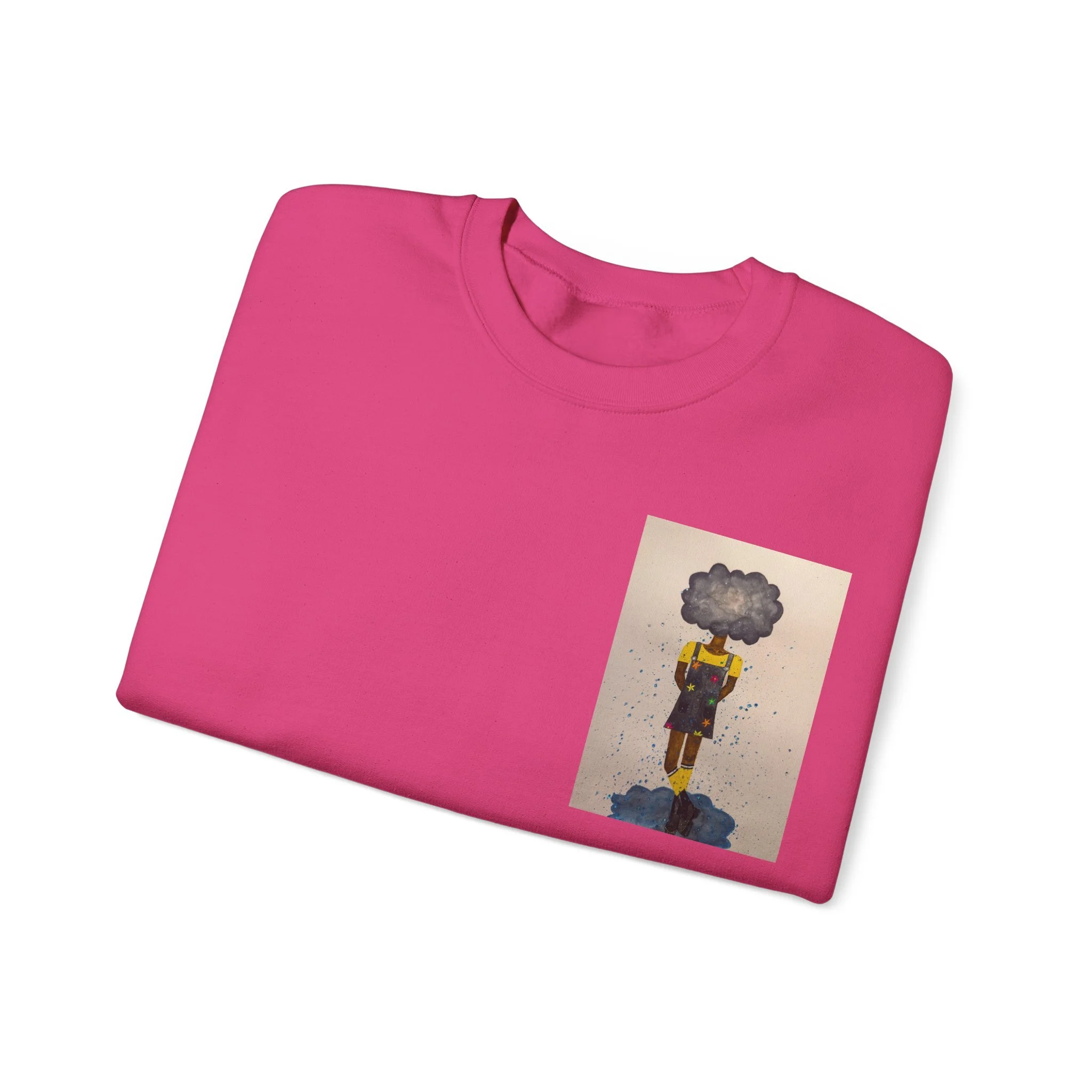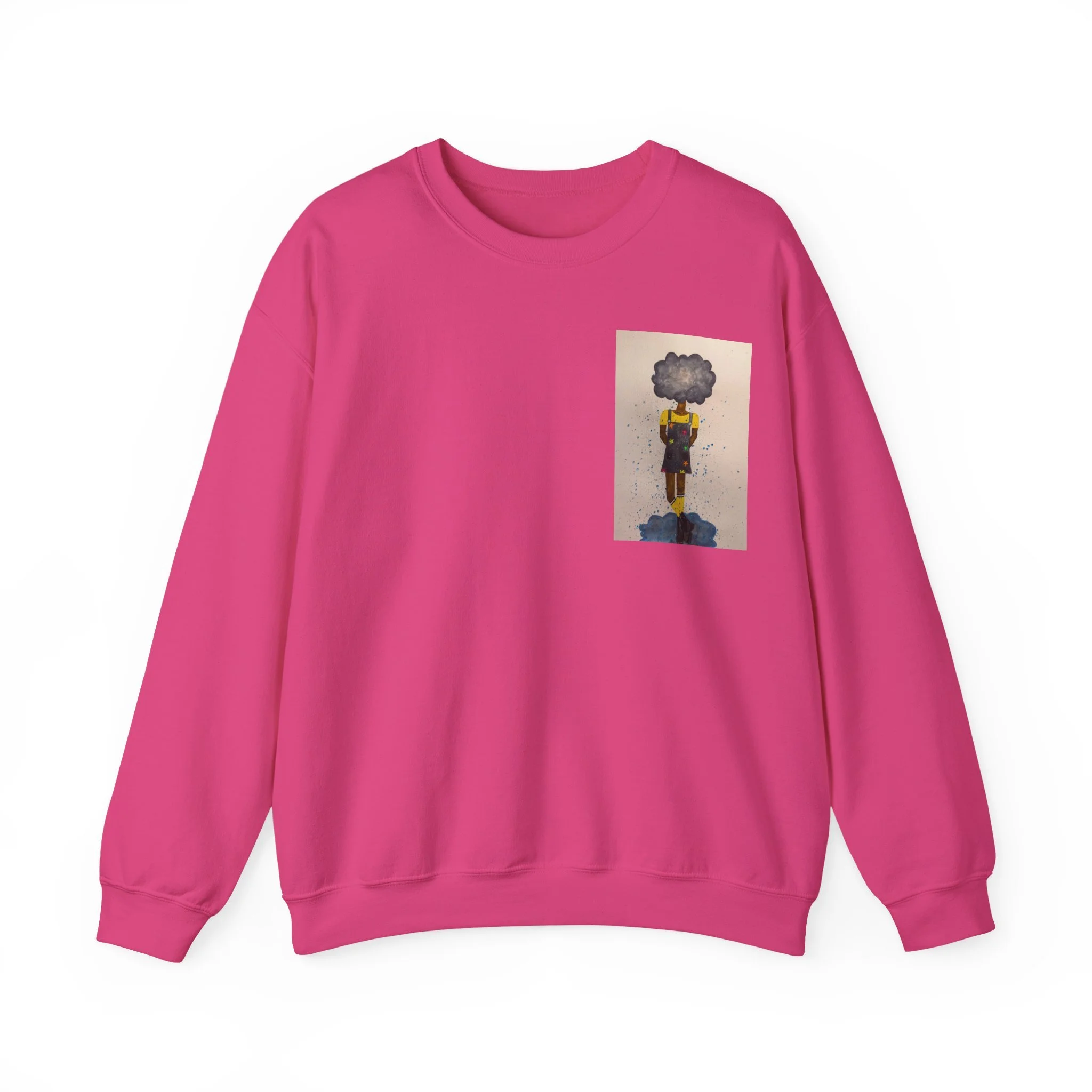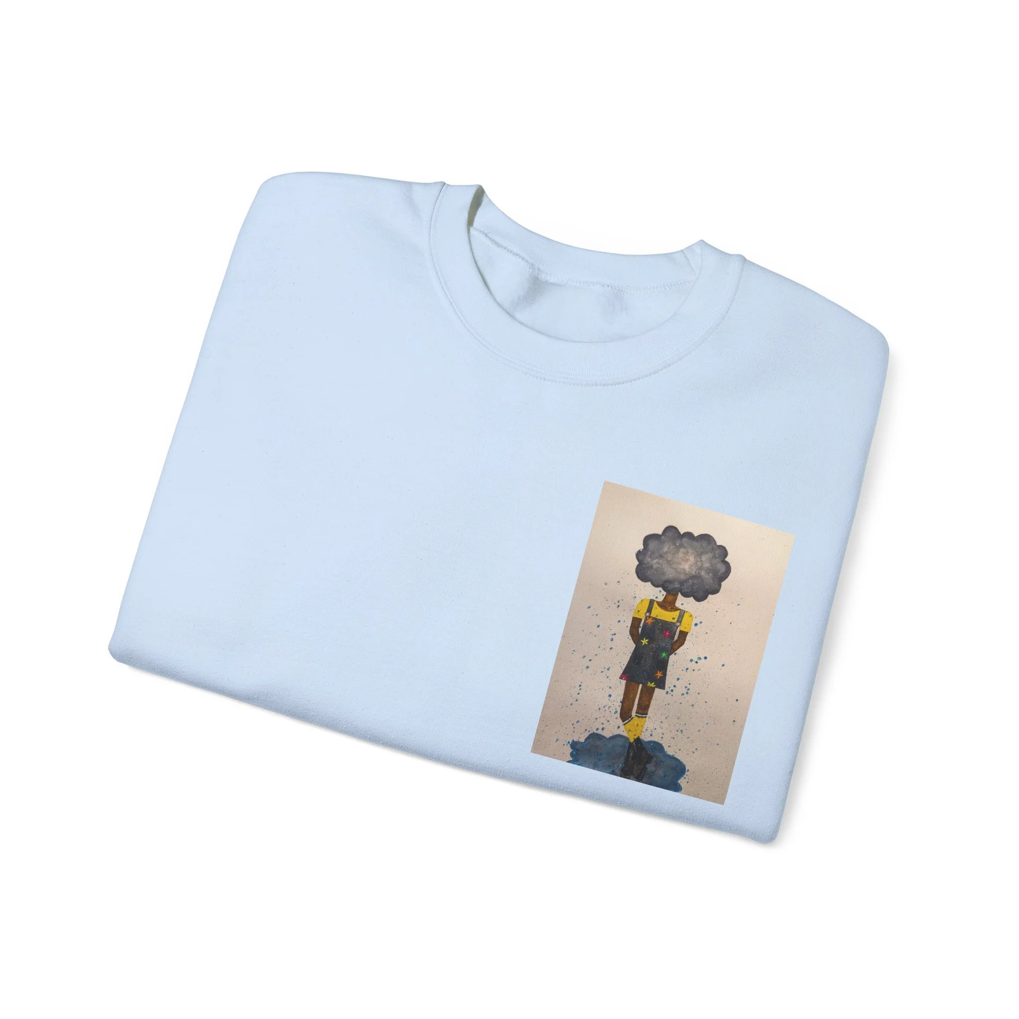 Soft, slightly oversized, and quietly expressive — this crewneck settles into your routine like a familiar song. The front shows a small, artful print that reads like a pocket-sized daydream: a lone figure with a clouded head, painted in muted tones that catch during slow afternoons. The back carries a tiny, understated text at the nape for a subtle signature detail. Wear it on walks through rainy streets, on long coffee-shop afternoons, or at low-key gallery visits. The medium-heavy cotton blend and classic crew shape keep you warm without feeling bulky. It’s the sweatshirt you reach for when you want comfort that carries a little story.